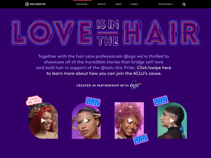 As a part of haircare brand OGX's Pride 2022 campaign, I led brand, creative, and media strategy for a custom content series Love Is In The Hair. A collaborative effort between OGX x The ACLU x Refinery29, our campaign boasted custom long-form video, TikToks, influencer activations, a UGC campaign, and a giveback drive hosted on a bespoke hub that houses all of the content on R29's O&O.